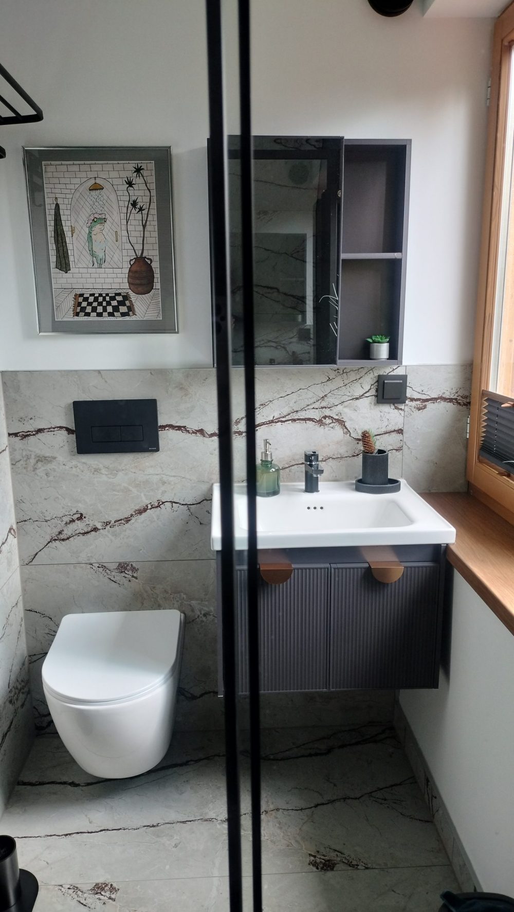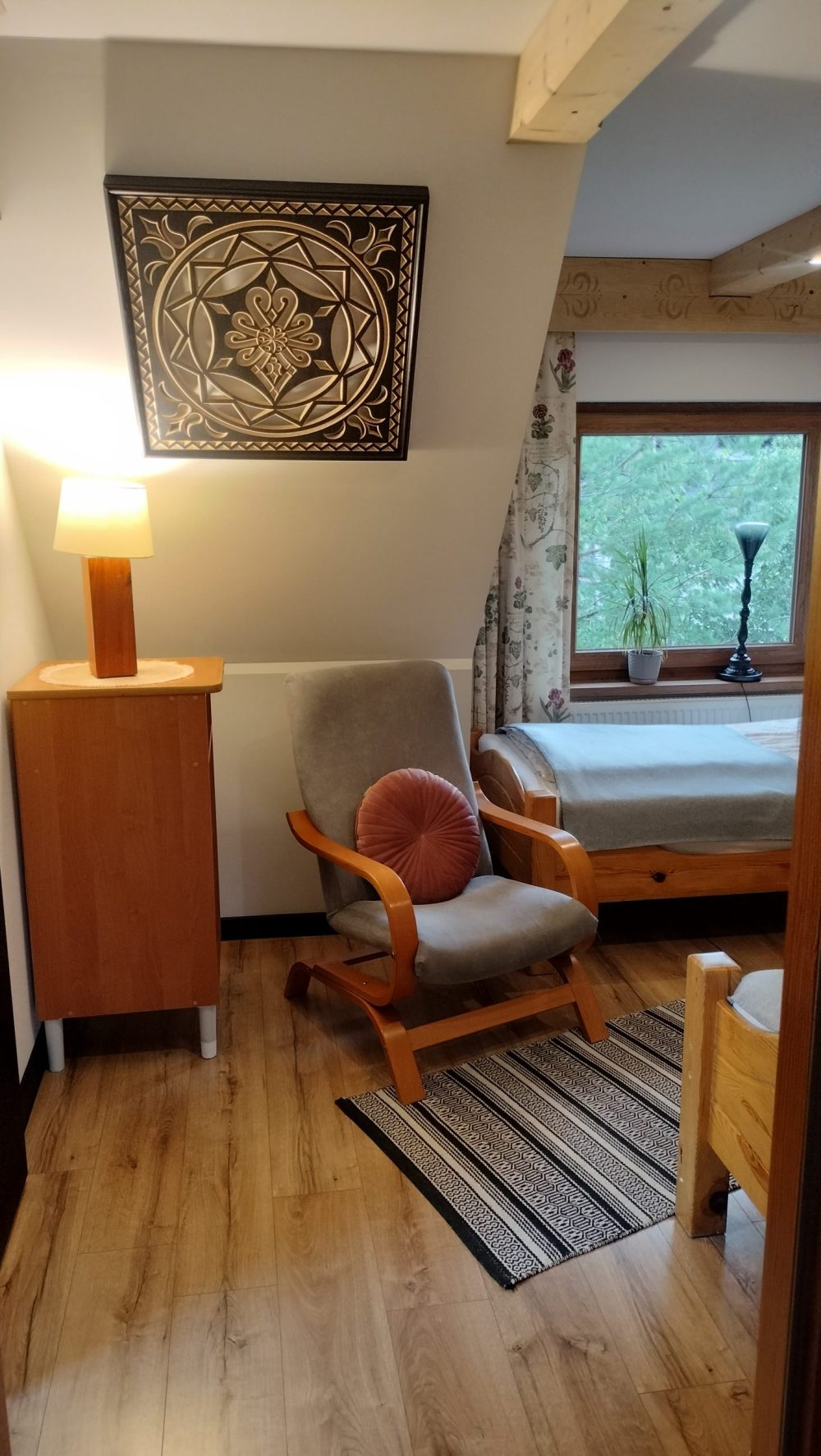Wygodny pokój ze skosami z elementami stylu regionalnego. Widok na Stok Narciarski Harenda. Prywatna łazienka .